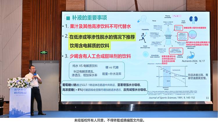 而从中医的角度来看,广东省妇幼保健院胡财喜医生更肯定了碳水化合物及电解质在高温暑热天气下应对身体脱水的帮助作用。他认为,高温环境中想较快速补充水分,比较合适的方式是饮用含适量碳水化合物(约6%-8%)的电解质饮料。这也与蒋鑫炜教授提及到的“由于葡萄糖和钠会通过 SGLT-1 转运体在肠道中共转运,帮助身体水分吸收,所以含有适量糖分和电解质的饮料,能较快补充水分”的观点不谋而合。