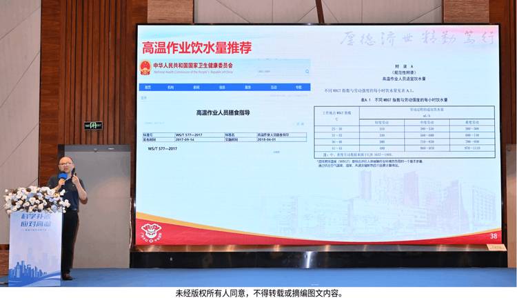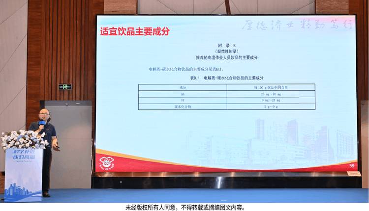 根据张锐主任分享的国家卫健委发布的《高温作业人员膳食指导》(WS/T 577—2017)中指出:高温作业人员饮品主要成分,比例为每100g饮品中含碳水化合物5~9g,钠25~70mg,钾9~25mg。
