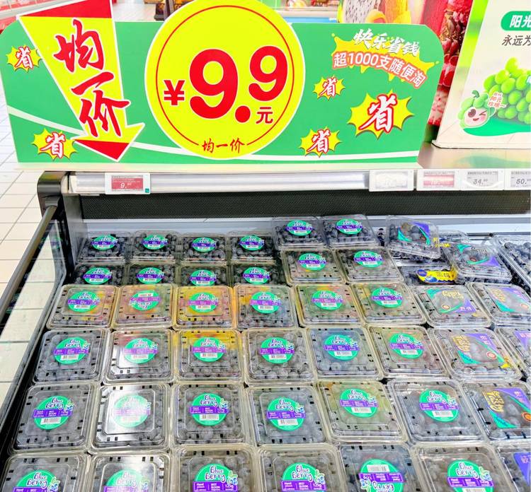 在生鲜区,9.9元/盒的秘鲁蓝莓、19.9元/组的鲜活鲍鱼等商品吸引了不少顾客驻足。工作人员介绍,这些高频消费品采用固定价格出售,不仅降低了消费者的决策成本,也提高了购物效率。“像蓝莓、鲍鱼这类生鲜,平时价格波动较大,现在统一标价,顾客买得放心。”