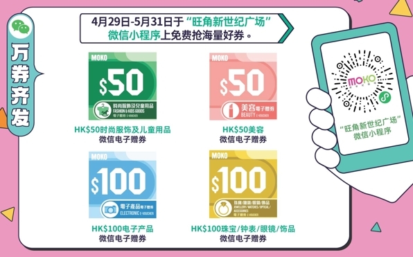 旅程未启,优惠先行,为方便内地旅客一站式购齐心仪好物,4月29日至5月31日期间,MOKO在"旺角新世纪广场"微信小程序内推出多款赠券,包括HK$50时尚服饰及儿童用品微信电子赠券、HK$50美容微信电子赠券、HK$100电子产品微信电子赠券、HK$100珠宝/钟表/眼镜/饰品微信电子赠券,旅客可免费领取后到指定商户使用,让购物更加轻松实惠。