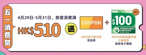 4月29日至5月31日期间,内地旅客于MOKO场内“即赚分”参与商户即日以电子货币消费满HK$510,即可获赠HK$50三联书店现金券及HK$500时尚服饰及儿童用品微信电子赠券。旅客更可凭三联书店现金券及已换领现金券的凭证到MOKO店以8折选购“书香港味”系列产品的冰箱贴、胸针、盖章本等经典港式手信,将港式风情定格于方寸之间,为亲朋好友传递美好惊喜。